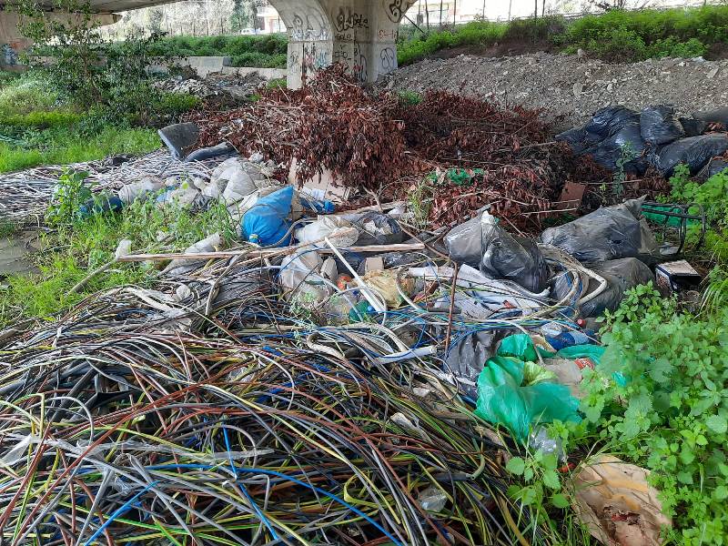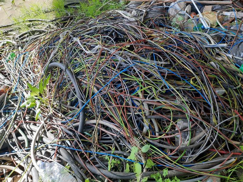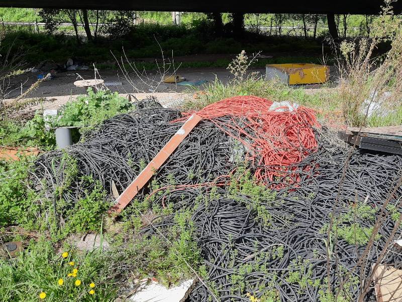 Quintali di cavi elettrici di ogni diametro, per decine di chilometri, giacciono accatastati sul terreno come enormi grovigli di serpi nere, azzurre, gialle, rosse. Ma anche vecchi mobili, elettrodomestici, montagne di calcinacci, sacchetti della spazzatura.