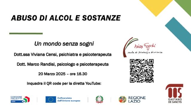 Col titolo “Abuso di alcol e sostanze – Un mondo senza sogni” e tenuto dalla dott.ssa Viviana Censi (psichiatra e psicoterapeuta) e dal dott. Marco Randisi (psicologo e psicoterapeuta), è indirizzato a famiglie e docenti, ma tutti potranno prendervi parte.