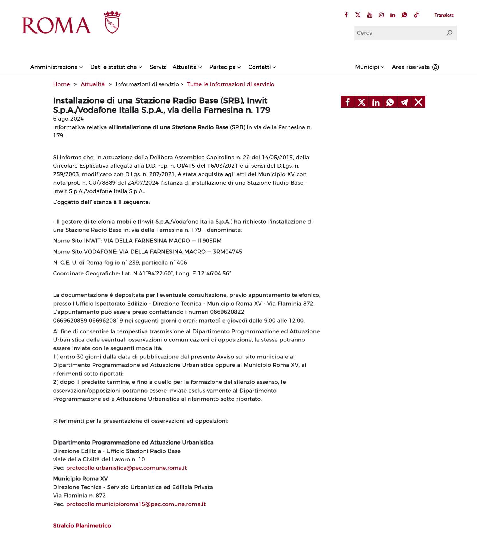 Era piena estate del 2024, esattamente il 6 agosto, quando sul sito web del Municipio XV viene pubblicato un avviso col quale, come da regola, si rende noto alla cittadinanza di aver ricevuto in data 24 luglio la richiesta d’installazione “di una Stazione Radio Base – Inwit S.p.A./Vodafone Italia spa” informando che eventuali opposizioni alla stessa dovevano essere inviate al XV entro 30 giorni dal 6 agosto.