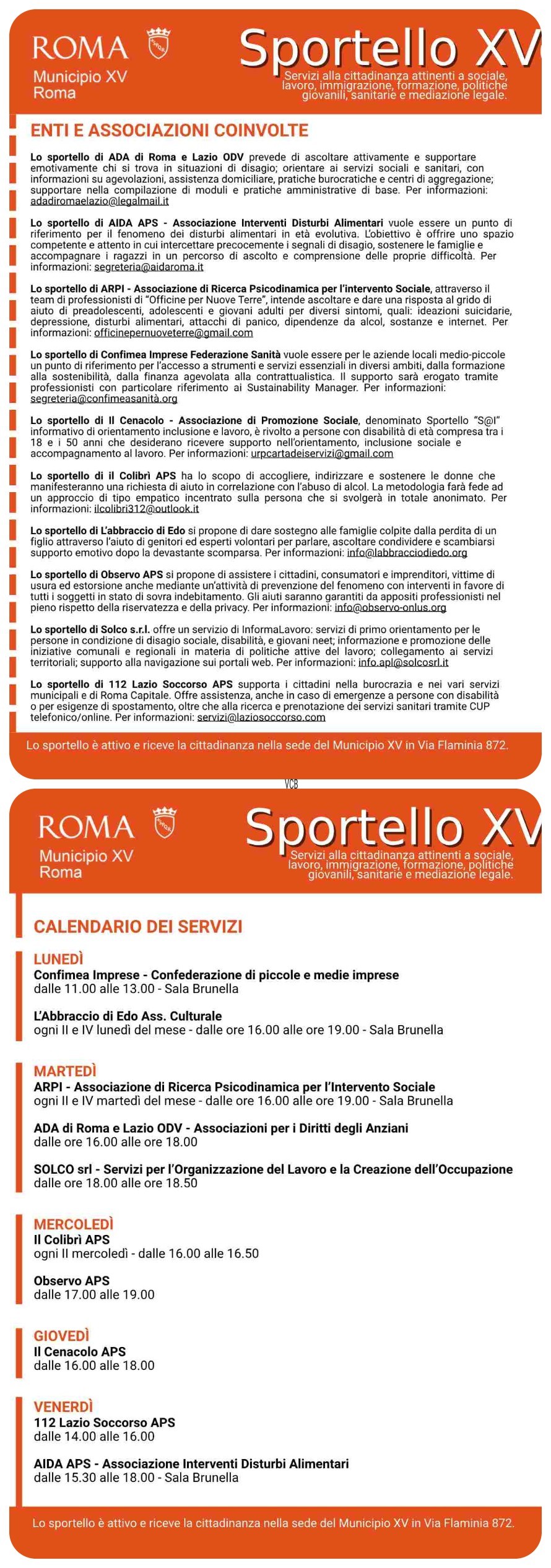 Sostenere l’erogazione di servizi utili alla cittadinanza riguardanti tematiche sociali, del lavoro, immigrazione, formazione e bandi, accesso alla Pubblica Amministrazione. E ancora, politiche giovanili, sanitarie, di mediazione legale. Queste le finalità dello “Sportello XVoi” aperto oggi, lunedì 5 maggio, in via Flaminia 872, nei locali del Municipio XV grazie alla collaborazione di dieci associazioni.