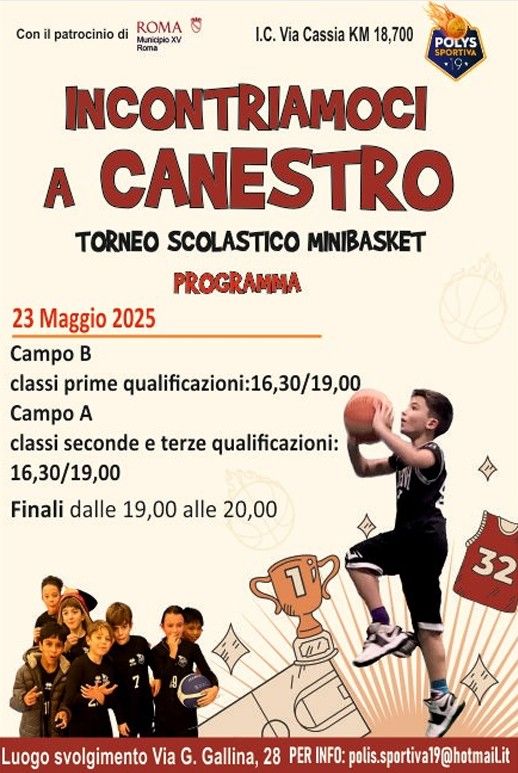 Venerdì 23 maggio, nei plessi scolastici Amaldi e Soglian dell’Istituto Comprensivo “Via Cassia km 18,700” si disputerà il torneo di minibasket “Incontriamoci a canestro”, pensato come progetto di integrazione e formazione, e mirato a rendere lo sport uno strumento capace di annullare le distanze, valorizzare le diversità, anche culturali e sociali, e promuovere l’inclusione anche di bambini con disabilità intellettiva e relazionale.