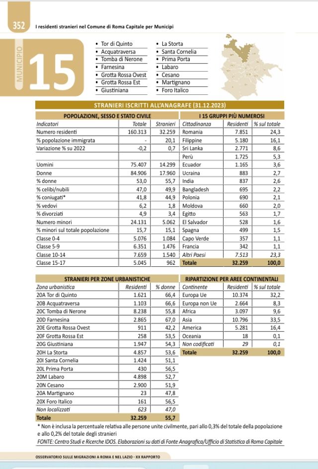 Per quanto riguarda il municipio XV, gli stranieri iscritti all’anagrafe municipale alla data del 1°gennaio 2024 sono 32.259 (erano 32.022 nel 2024), pari al 20,1% della popolazione complessiva del XV. Le comunità immigrate sono composte per il 55,7 % da donne.  I minori sono 5.062 pari al 15,7 % del totale.
