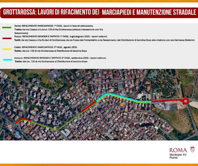 “Nell’ambito dell’accordo quadro per le opere giubilari e della programmazione di manutenzione straordinaria del Municipio XV, sono in corso gli interventi di rifacimento dei marciapiedi e del manto stradale di Via di Grottarossa, realizzati in più fasi perché coordinati con gli interventi in corso sul muro di via Veientana che stanno procedendo speditamente”.