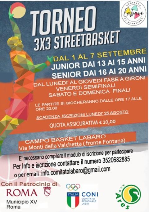 Organizzato dal Comitato di Quartiere Labaro con il supporto tecnico sportivo della ASD Ares e col patrocinio del Municipio XV, da lunedì 1° settembre a domenica 7, a Labaro, nel nuovo campo di basket in via Monti della Valchetta, si terrà la prima edizione del “torneo 3×3 streetbasket”.