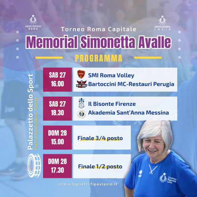 “Siamo molto orgogliosi della reazione delle società – ha spiegato il Presidente del Comitato Territoriale Roma, Claudio Martinelli – perché hanno accettato da subito il nostro invito a partecipare. Simonetta ha lasciato un segno profondo nella storia della nostra pallavolo e faremo sì che la sua eredità non venga dispersa. Aggiungo che questa è un’opportunità per tutti gli amanti del volley che avranno la possibilità di vedere a Roma squadre di livello assoluto”.