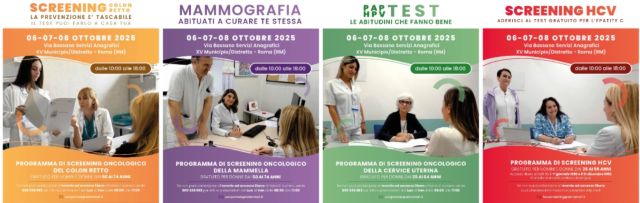 Lì, i residenti del territorio della ASL Roma 1 potranno effettuare gratuitamente i seguenti esami: screening oncologico della cervice uterina, gratuito per donne dai 25 ai 64 anni; screening oncologico del colon retto, gratuito per uomini e donne dai 50 ai 74 anni; screening oncologico della mammella, gratuito per donne dai 50 ai 74 anni; screening HCV – test per epatite C, gratuito per uomini e donne dai 35 ai 55 anni.