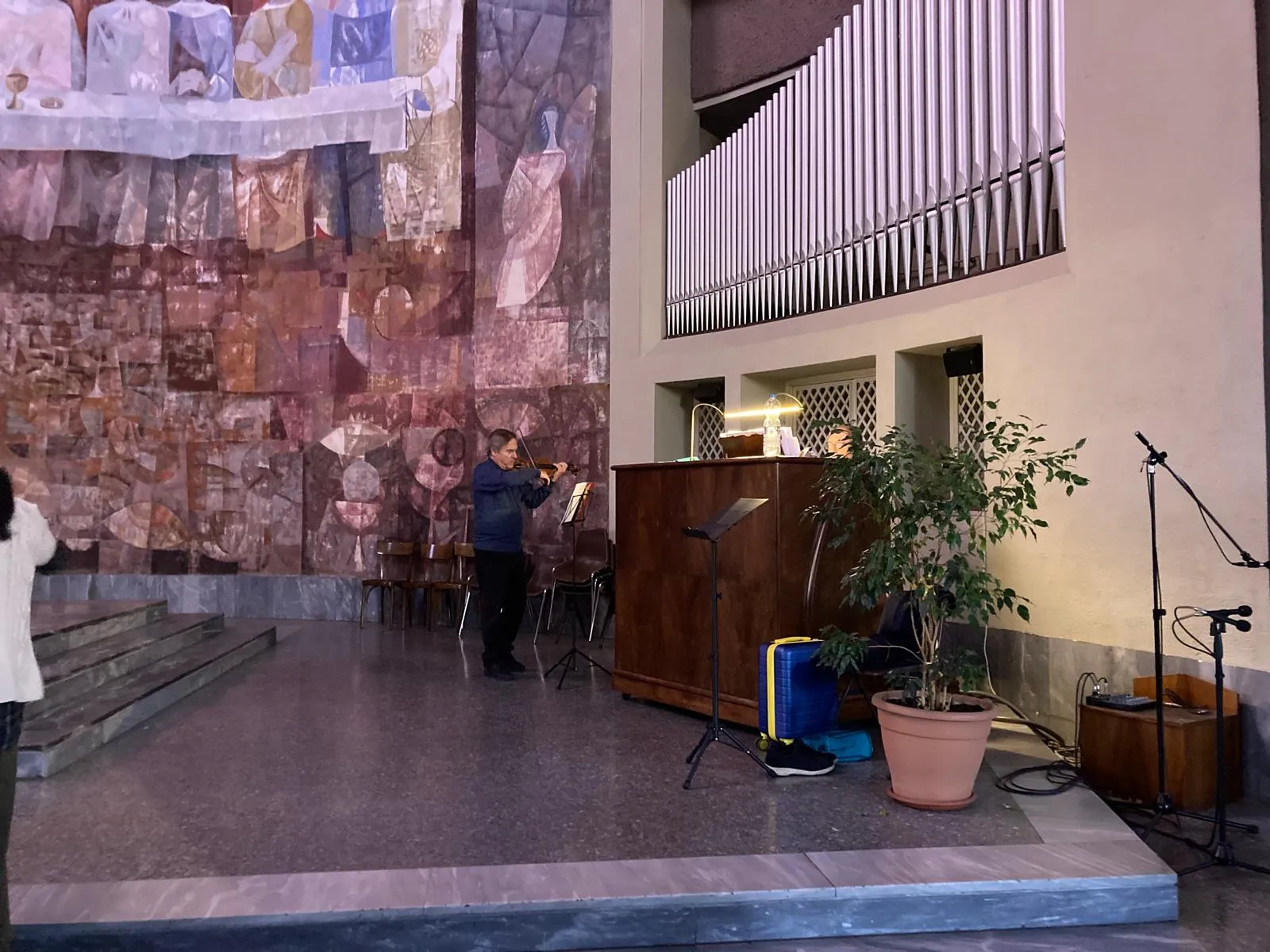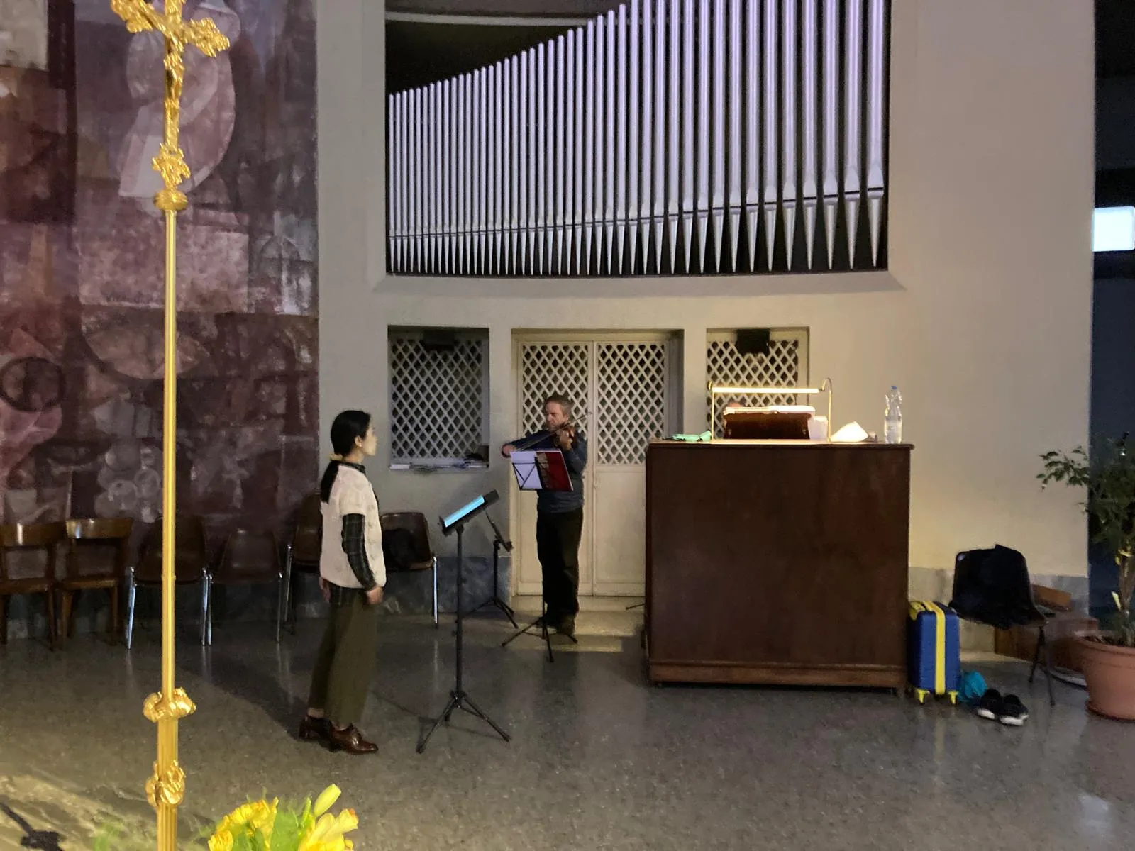 Li abbiamo incontrati alla prova di ieri in chiesa, approfittando di una pausa per rivolgere loro qualche domanda, cominciando da un violino uscito da una leggendaria bottega del settecento.
