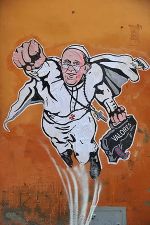 scena urbana. Lo hanno definito “il Banksy del Vaticano”, definizione nata soprattutto dopo il successo internazionale di “Super Pope”, il murale cui Papa Francesco veniva trasformato in un supereroe con la borsa “Values/Valori”. Un murale che piacque così tanto a Bergoglio da ricevere l’artista in udienza.