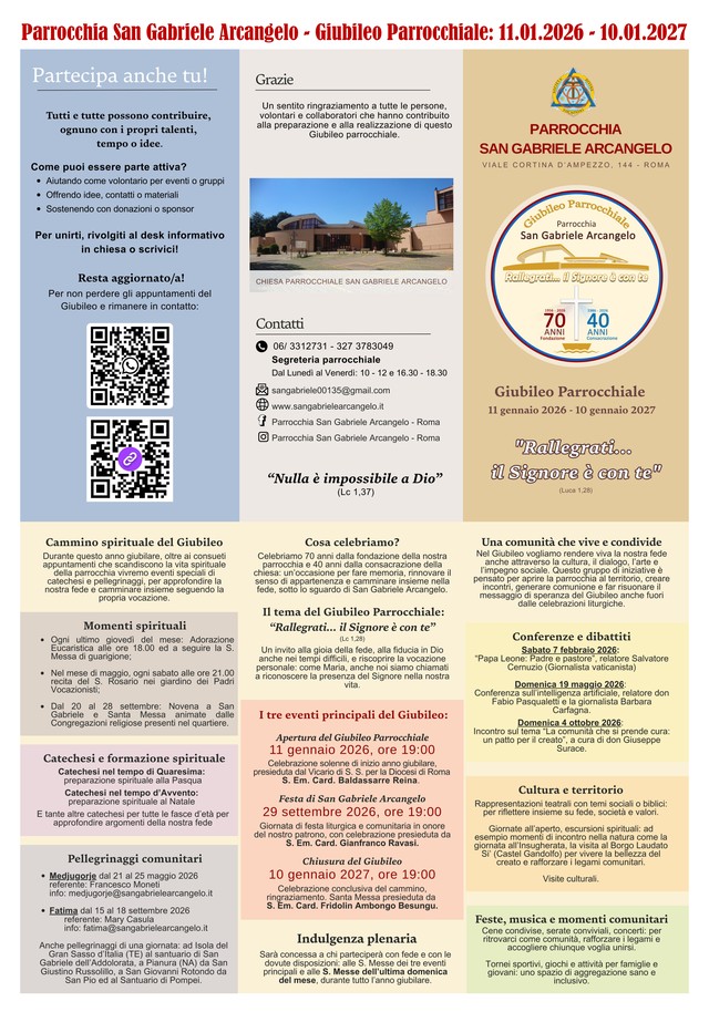 Un cammino pensato per intrecciare fede e vita quotidiana, con il tema “Rallegrati… il Signore è con te” come filo conduttore e come invito che guarda alla comunità nel suo insieme e che, ancora una volta, restituisce alla parrocchia di San Gabriele Arcangelo il ruolo che da settant’anni svolge in questo spicchio di Roma: non solo luogo di culto, ma punto di incontro, di ascolto e di relazione.
